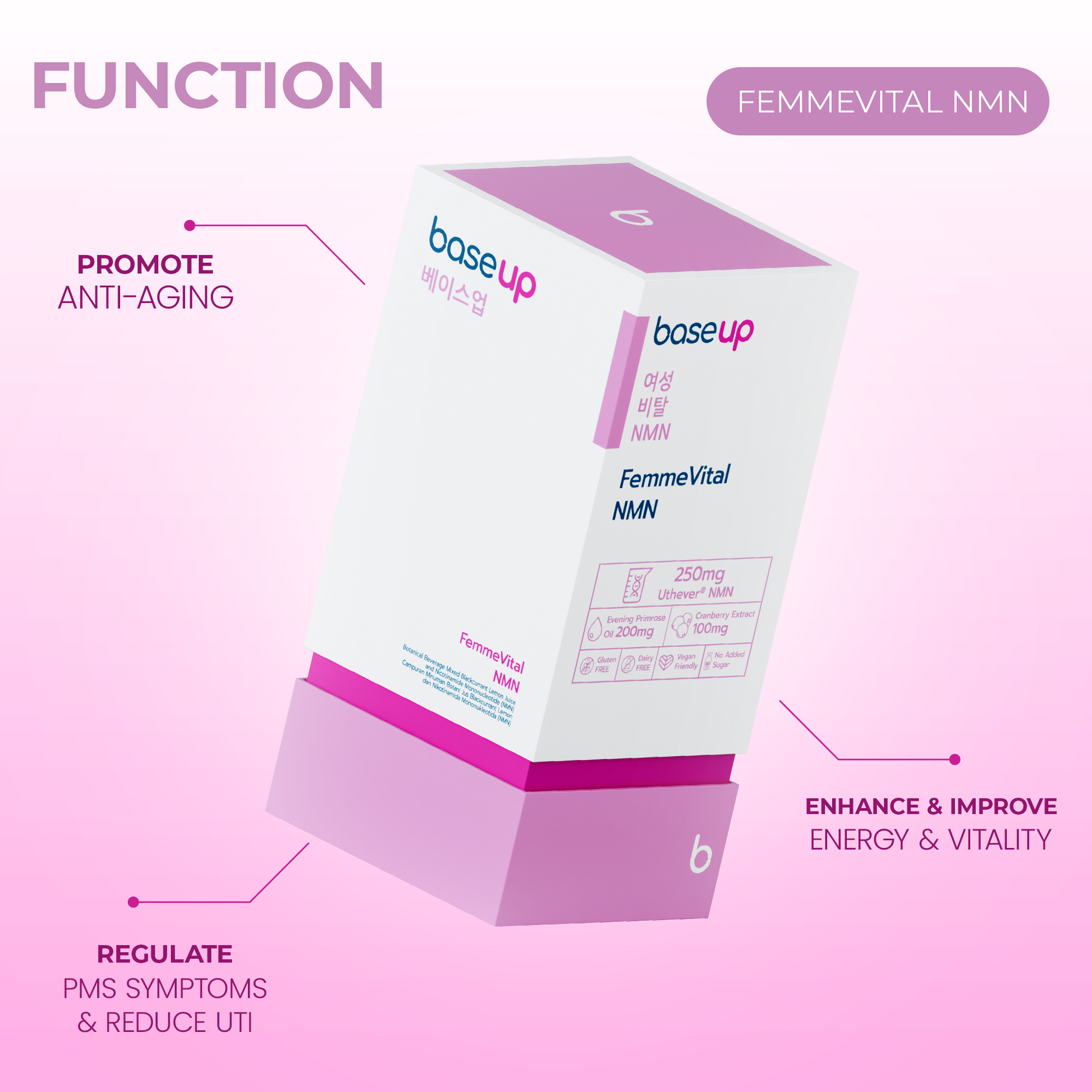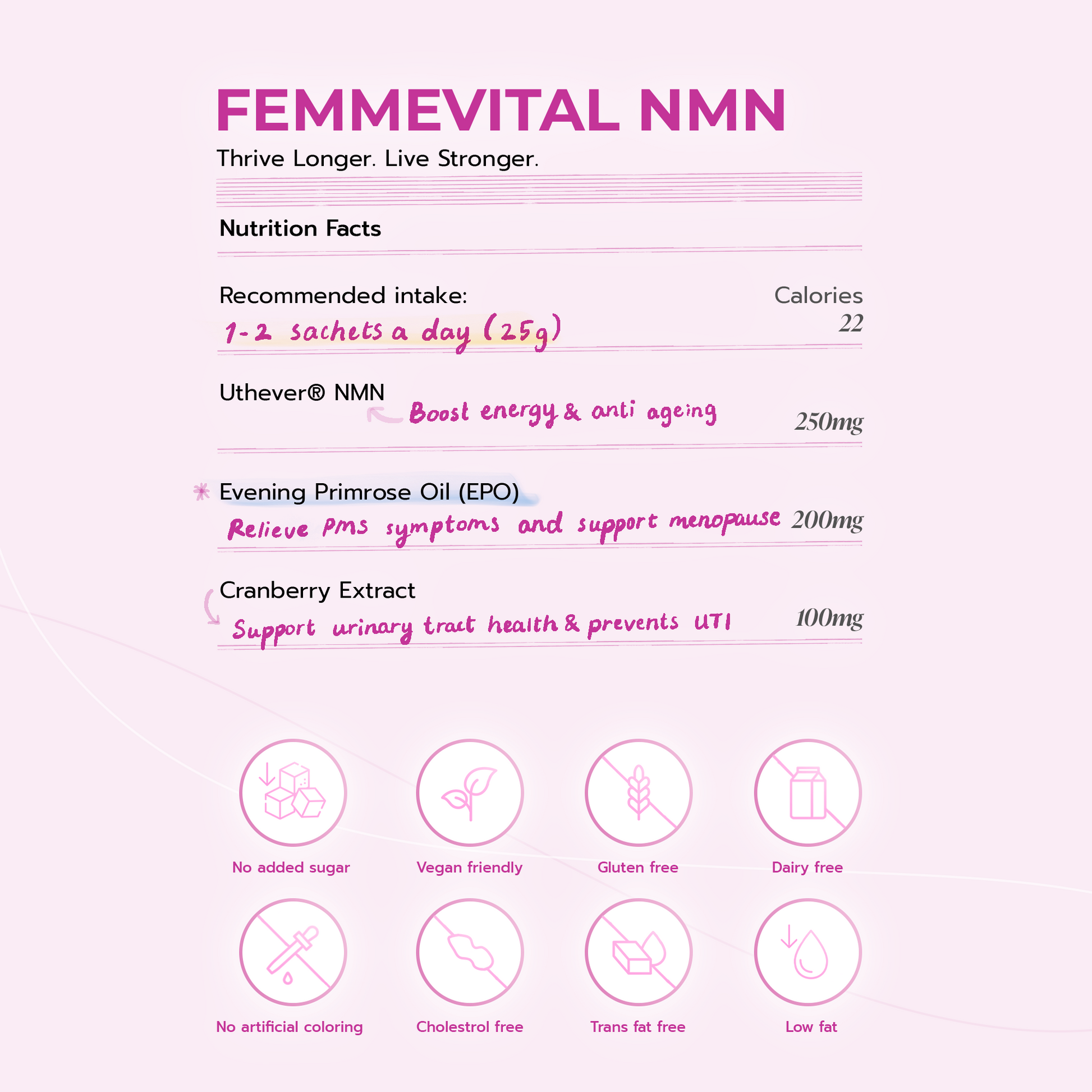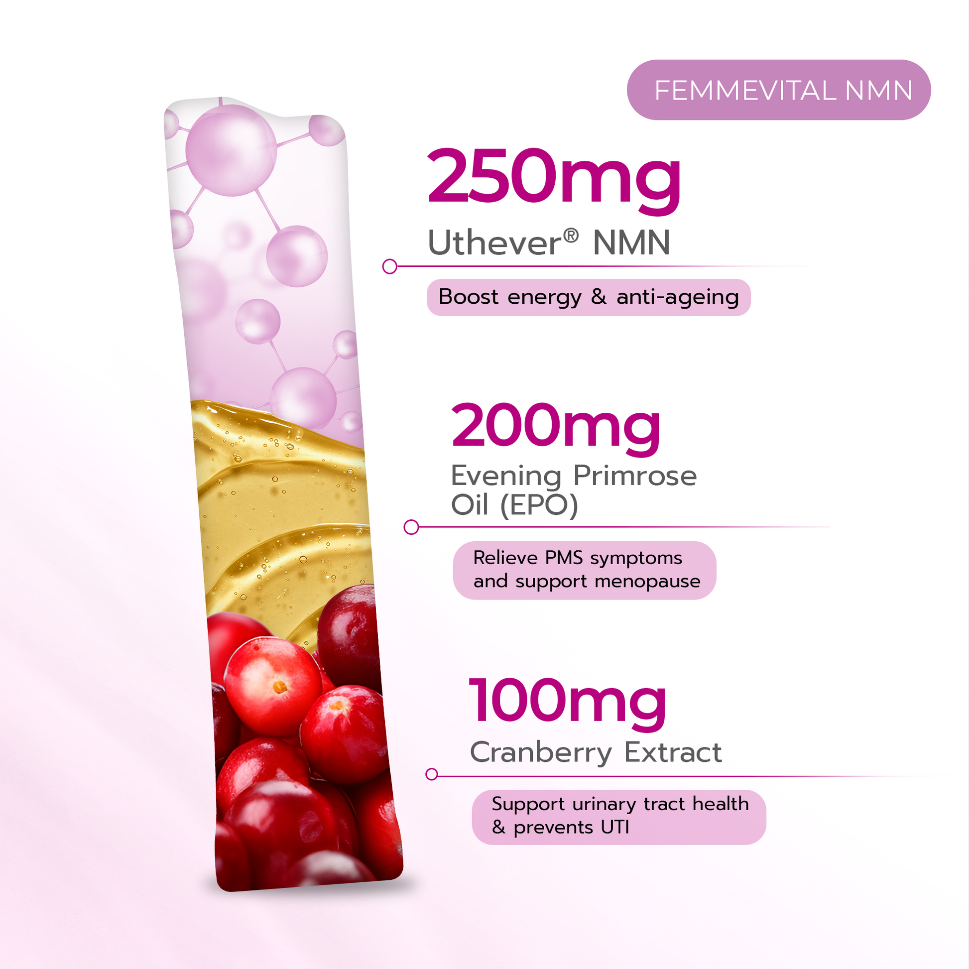 FemmeVital NMN goes beyond that, it’s specially made for women, combining Uthever® NMN with Evening Primrose Oil and Cranberry Extract to support hormonal balance, energy, and urinary tract health.